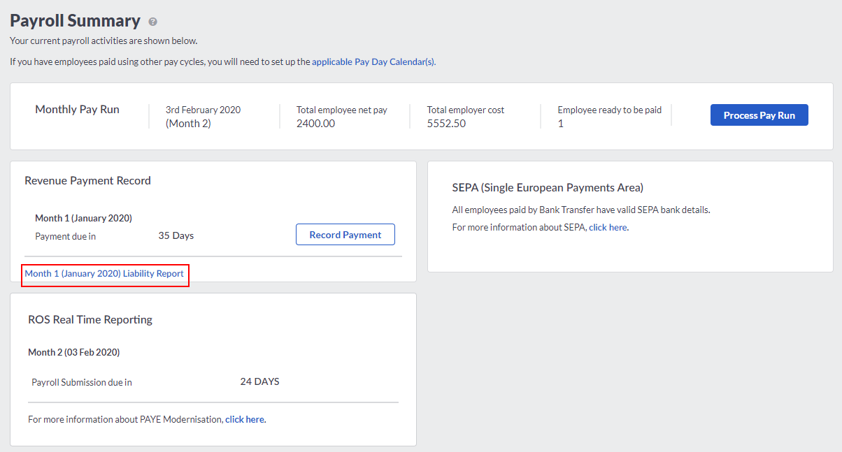 Use the liability reconciliation report to check your liability to Revenue. You can get the liability for each pay period in Sage Payroll.